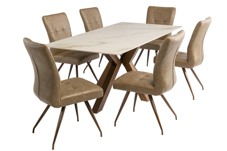 Everything about the Sicily dining table makes a statement. The contrasting smooth Kass Gold sintered stone top, with unique grey and gold veining, and the elegant brushed brass base create drama and distinction. Designed for everyday living, this table comfortably seats up to 6 people and can be complimented by many of our brushed brass dining chairs.