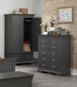 The Daniella chest of drawers features solid pine frame with a dark grey lacquer finish.Exceptionally stylish, the Daniella Bedstead will add a touch of class to any bedroom.The Daniella collection is French-inspired in design.The elegant design will complement both contemporary and traditional décor schemes.