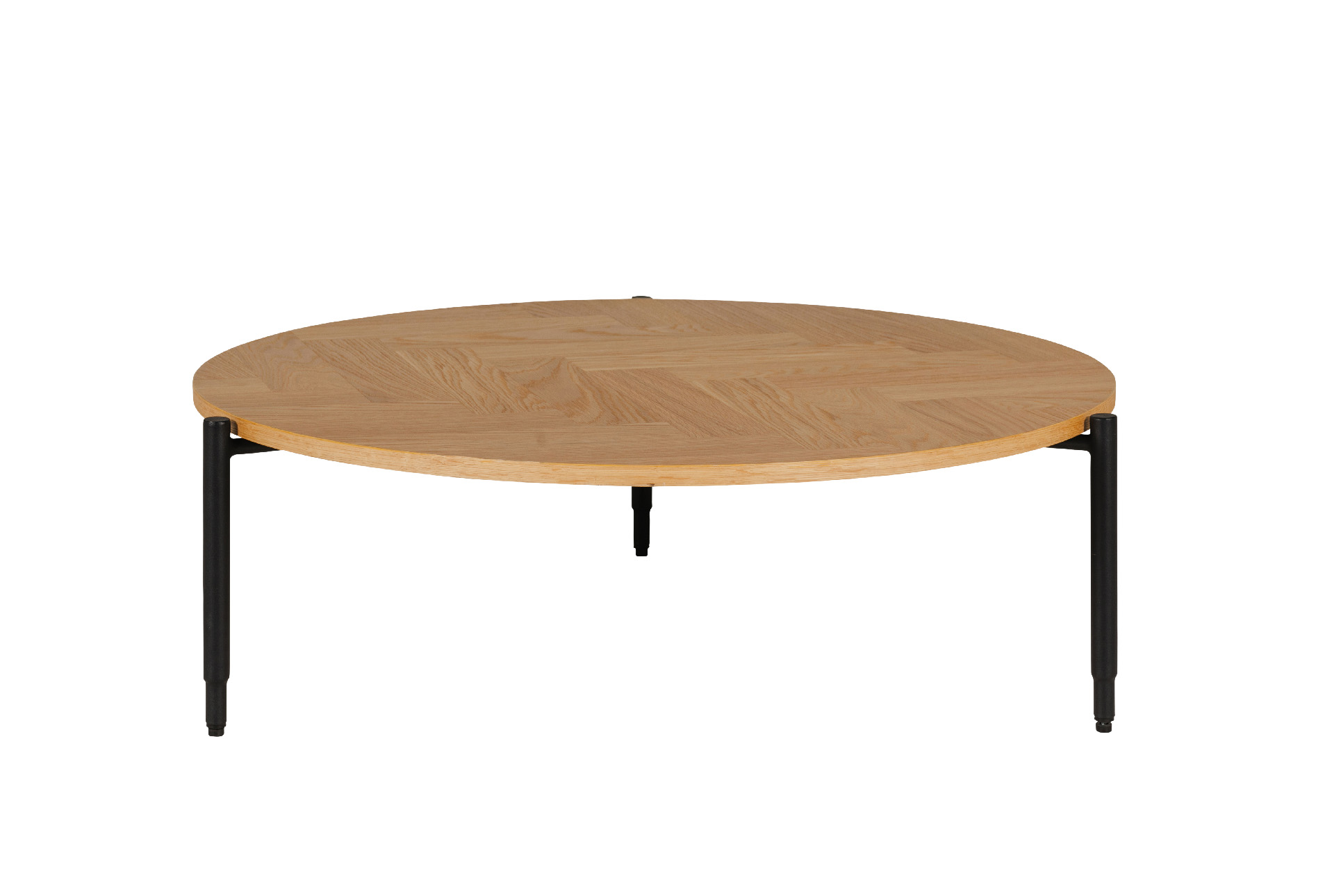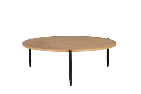 Nate Coffee Table in Natural Oak offers a chic contemporary design with a parquet-style surface that adds visual interest and texture. Constructed from engineered wood with a natural oak finish, it showcases a sophisticated blend of traditional and modern aesthetics. The table is supported by black powder-coated metal legs, which provide a sleek and sturdy foundation while adding an industrial touch.
