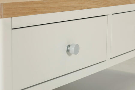 Freya Coffee Table in Natural – a timeless addition to your living space. With its soft neutral painted finish, this versatile table effortlessly complements any room decor. The painted frame, coupled with the light-coloured oak top, creates a harmonious balance of elegance and warmth. The smooth round edges and flush sides and tops contribute to its clean and modern design. Finished with matt silver round handles, the Freya Coffee Table is as stylish as it is functional, perfect for enhancing the aesthetic of your home.
