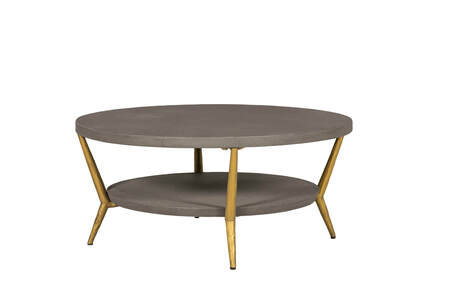 Tabitha Round Coffee Table in Grey – a statement piece that blends industrial chic with contemporary elegance. With its dark grey brushed concrete finish on plywood, this table exudes a sophisticated urban vibe. Featuring hammered metal legs in a bronze finish, the Tabitha Coffee Table adds a touch of rustic charm and durability.