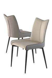 An effortless modern dining chair beautifully tailored in grey contrasting faux leathers with a stunning curved design. Features piping detail throughout and finished with black powder coated legs.