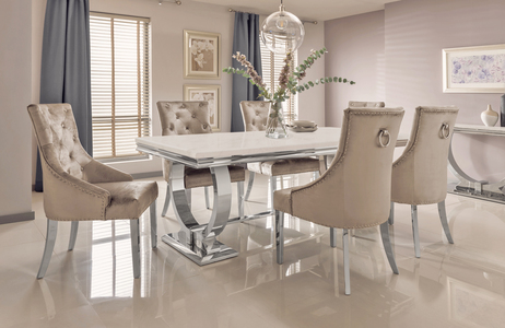 Ultra chic and high end, the Arianna is the ultimate dining collection for those who crave style and glamour. Its unique marble top is supported by a polished stainless steel base.