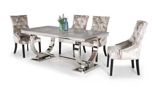 Ultra chic and high end, the Arianna is the ultimate dining collection for those who crave style and glamour. Its unique marble top is supported by a polished stainless steel base.