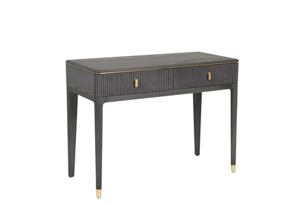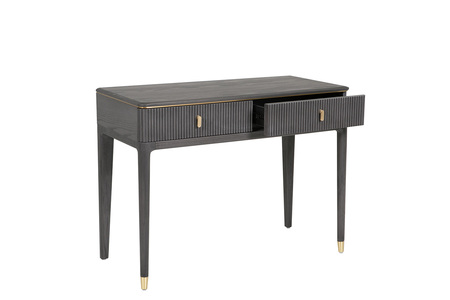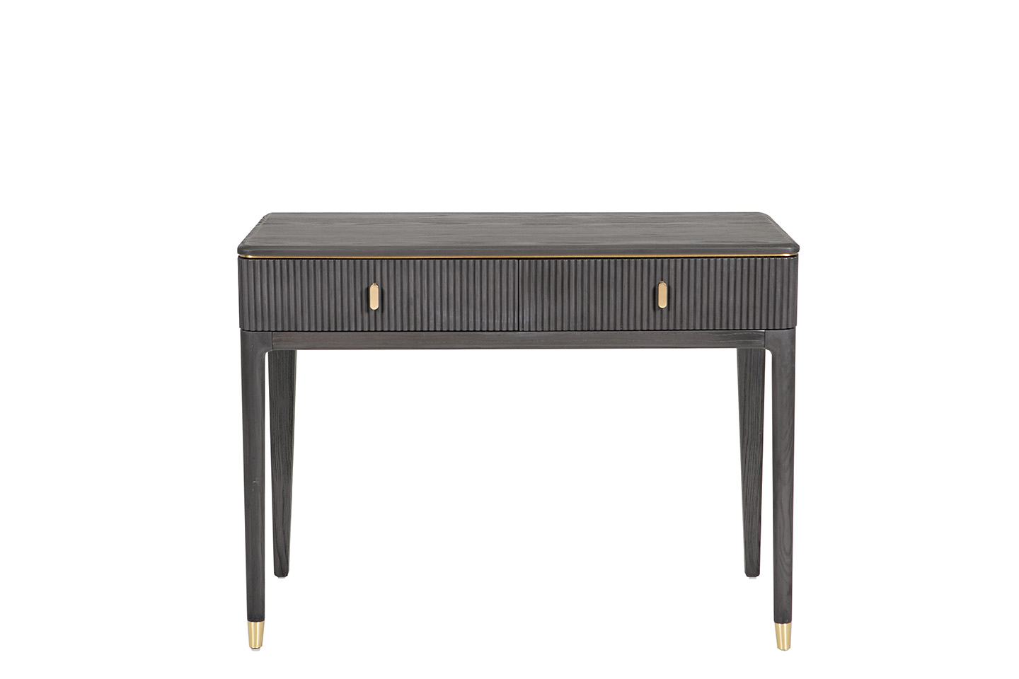 Diletta 2 Drawer Dressing Table in Ebony – a luxurious addition to your bedroom from our exclusive Luxury Bedroom Collection. Inspired by Art Deco design, this dressing table exudes elegance and sophistication. Crafted with ash wood veneers hand-laid in a V match pattern, it showcases meticulous attention to detail. The ebony-coloured wood and brushed gold metal hardware and inlay add a touch of opulence to your bedroom decor.