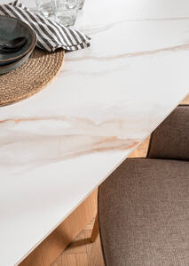 Evie Rectangle Extending Table in Sand – a modern marvel designed with soft curved edges, perfect for contemporary interiors. Its sintered stone table and sideboard tops are impervious to heat or cold, ensuring durability and resilience. With waterproof, scratch-resistant, and stain-proof qualities, maintaining its pristine condition is effortless. The non-porous and antibacterial features guarantee easy cleaning. Finished with an oak-coloured base, the Evie Dining Table is as stylish as it is functional, adding a touch of elegance to any space.