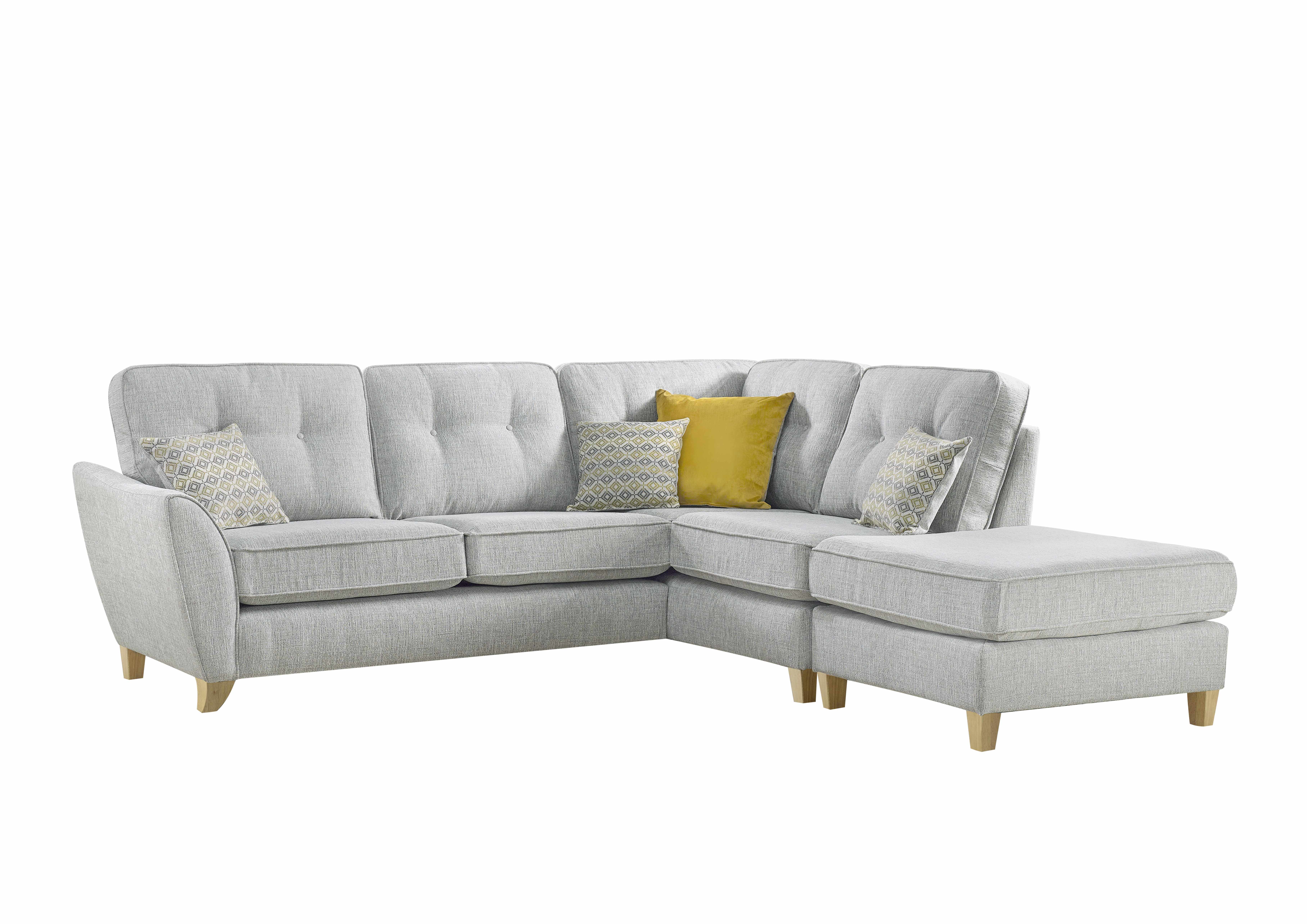 Introducing the Ashley Large Chaise Right . This chaise features gently curving teardrop arms and chic accent cushions detailed with smart button accents, exuding contemporary charm and sophistication. Its simple wooden legs add an elegant touch, perfect for creating a Scandinavian-inspired ambiance. Enrich your decor with warm accent colors that subtly enhance the chaise''s appeal. It harmonizes effortlessly with minimalist white furniture and wooden accents, creating a clean, bright atmosphere. The neutral grey upholstery provides a versatile backdrop, allowing the vibrant hues in the cushions to stand out. To achieve a cohesive look, incorporate mustard yellow tones from the cushions into accessories such as curtains, lighting fixtures, or vases. The cool-toned body fabric complements light blue accents, offering flexibility in styling your living space.