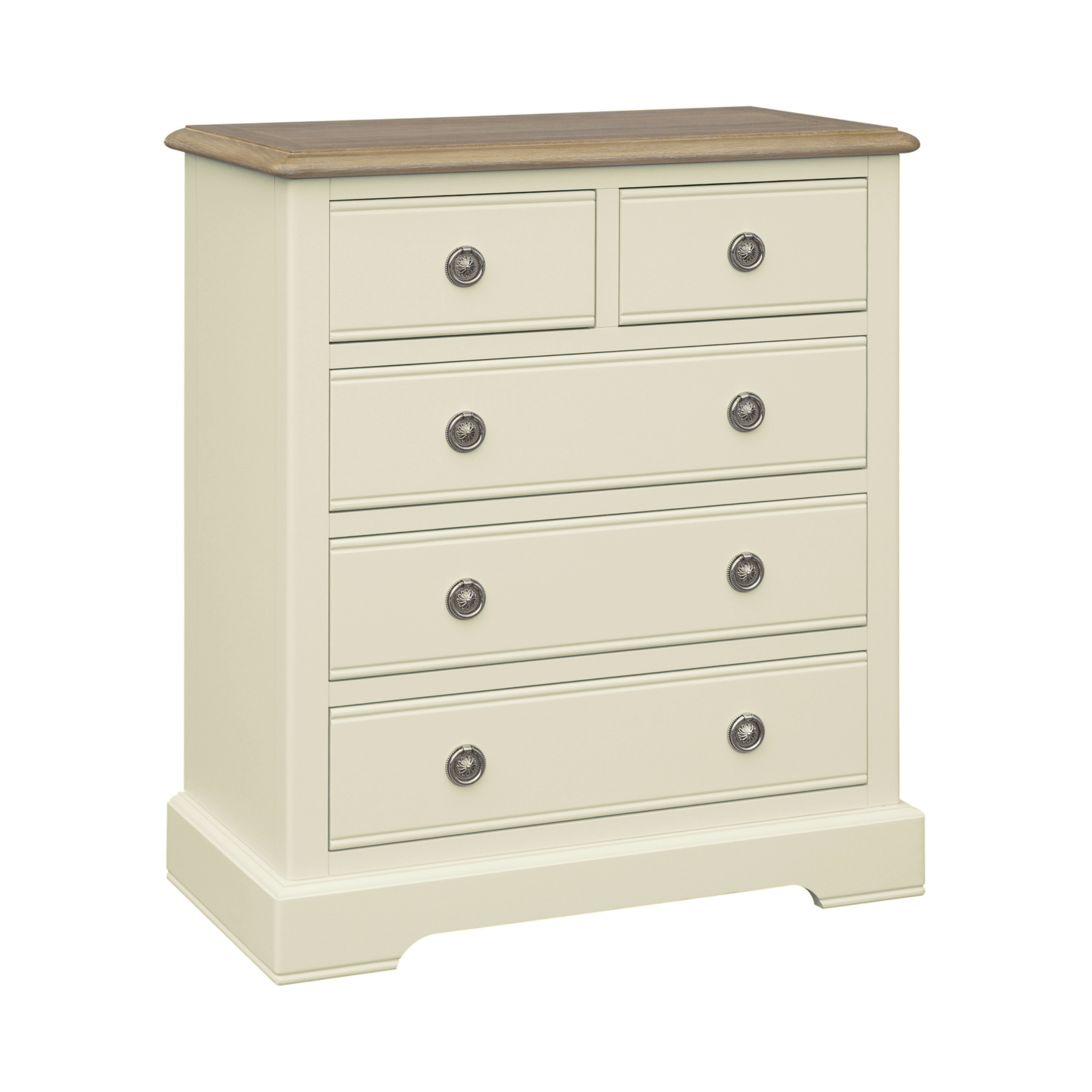 The Meghan Oak Dining and Occasional Range is designed in a French style with simple panels and finished with a classic chrome knob. Frames are finished in subtle Ivory with washed oak tops.