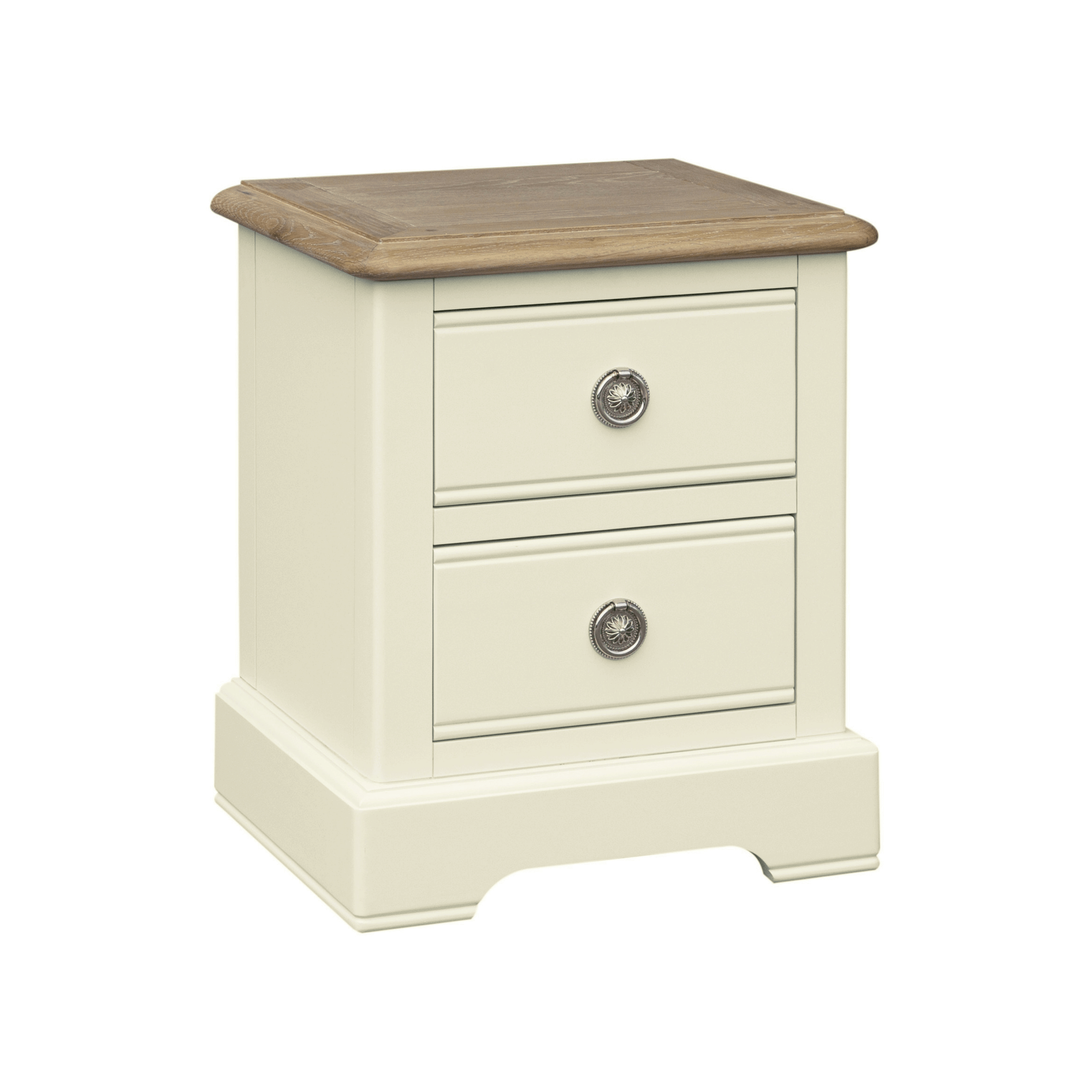 The Meghan Oak Dining and Occasional Range is designed in a French style with simple panels and finished with a classic chrome knob. Frames are finished in subtle Ivory with washed oak tops.