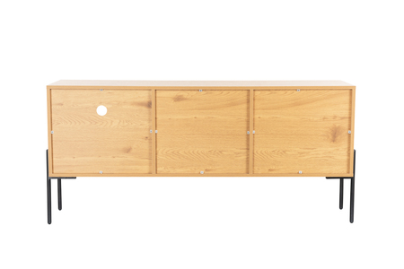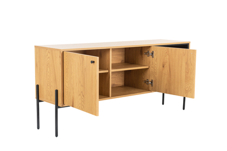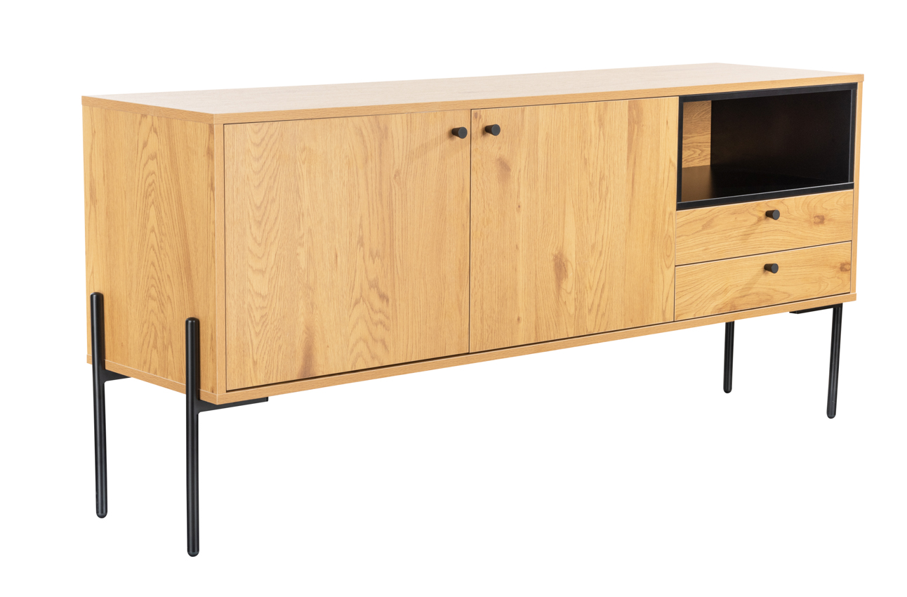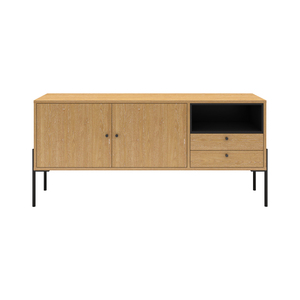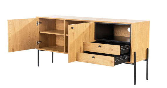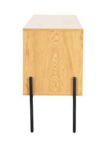 Natural oak melamine, powder-coated black metal legs, black hardware and accents.