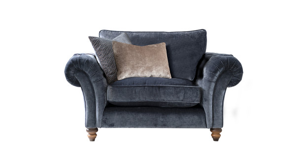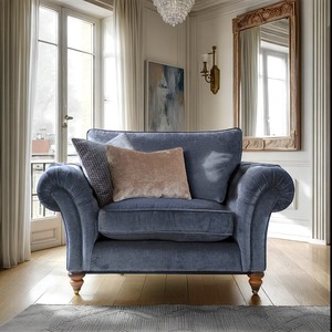 This timeless style adds a high jolt of glamour and opulence to any space, featuring generous turned-out buttoned scroll arms and thick seat cushions, with turned wooden feet to add beautiful, sumptuous detailing.