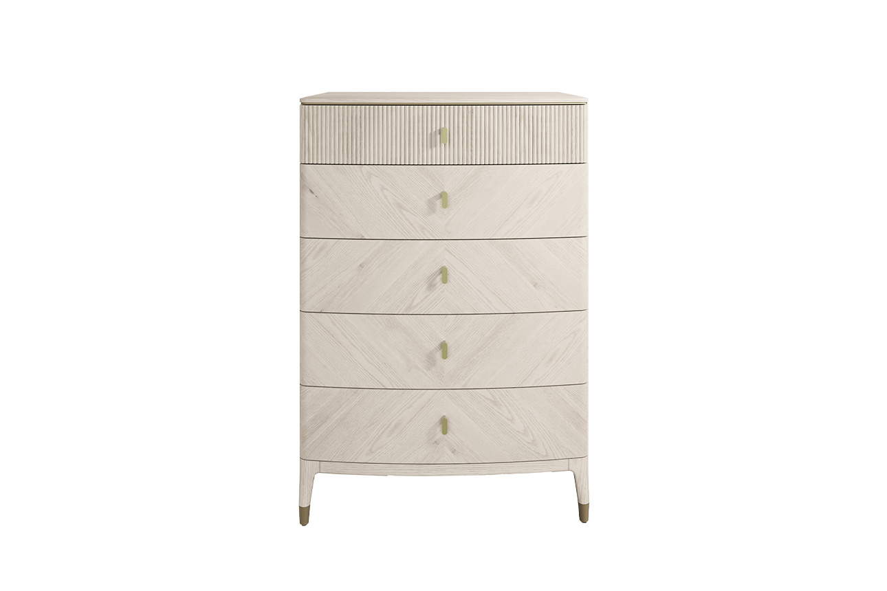 Diletta 5 Drawer Chest of Drawers in Stone – a luxurious addition to your bedroom from our exclusive Luxury Bedroom Collection. Inspired by Art Deco design, this chest of drawers exudes elegance and sophistication. Crafted with ash wood veneers hand-laid in a V match pattern, it showcases meticulous craftsmanship and attention to detail. The warm stone colour wood, brushed gold metal hardware, and inlay add a touch of opulence to your bedroom decor.
