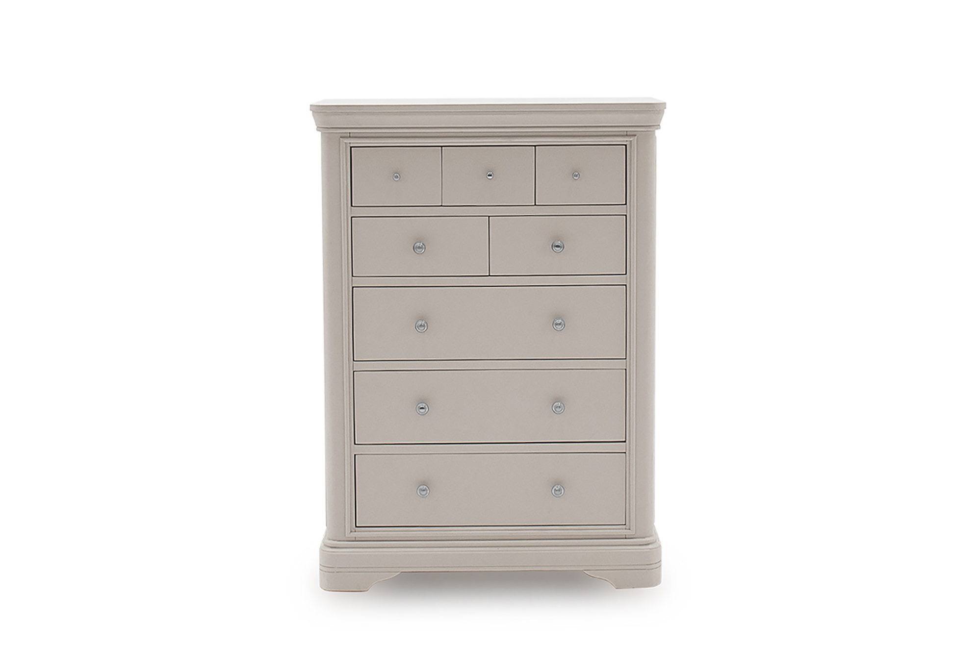 Every component of the Mabel bedroom is designed to emphasise the natural beauty of the wood. This taupe painted range features silver handles and elegant curves, and its robust design makes it both beautiful and practical.