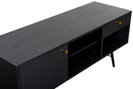 Black oak melamine, powder-coated black metal legs, copper metal accents.