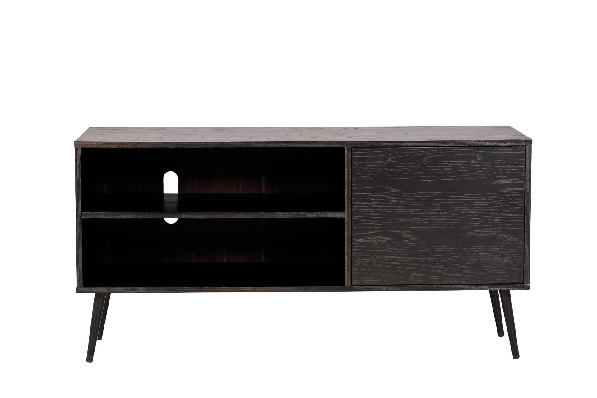Doolin TV Unit 1000 in Black. This sleek unit combines practical function with a minimal design, offering ample storage space and an outlet for easy cable connection. Its black finish adds a modern touch, while the clean lines ensure it complements any decor.