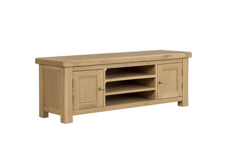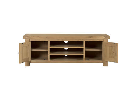 Delaney TV Unit 1400mm in Oak combines traditional charm with versatile functionality. This stylish TV unit features two door cabinets with shelving for ample storage, a central open section for multimedia devices, and a convenient cutout for easy cable access. Accented with sleek metal handles, the Delaney TV Unit is a practical and elegant addition to any living room.